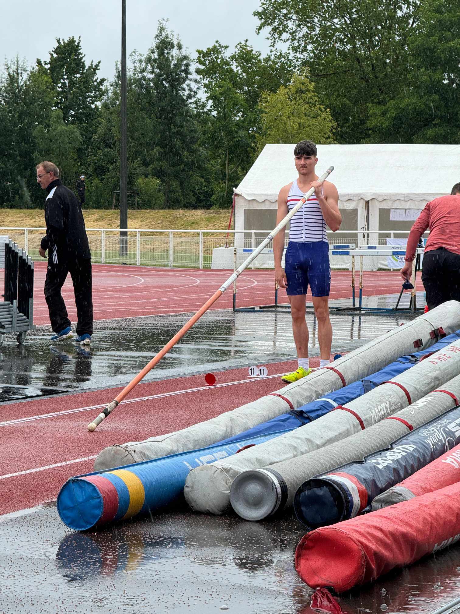 Léo DUPONT prend la 3e place du concours de saut à la perche avec une meilleure barre à 4m60. Il s’est ensuite essayé sans succès à 3 reprises à la barre suivante qui était de 4m75. Aucune déception puisqu’il a été devancé dans le concours par deux seniors qui ont respectivement franchit 5m20 et 5m40 !