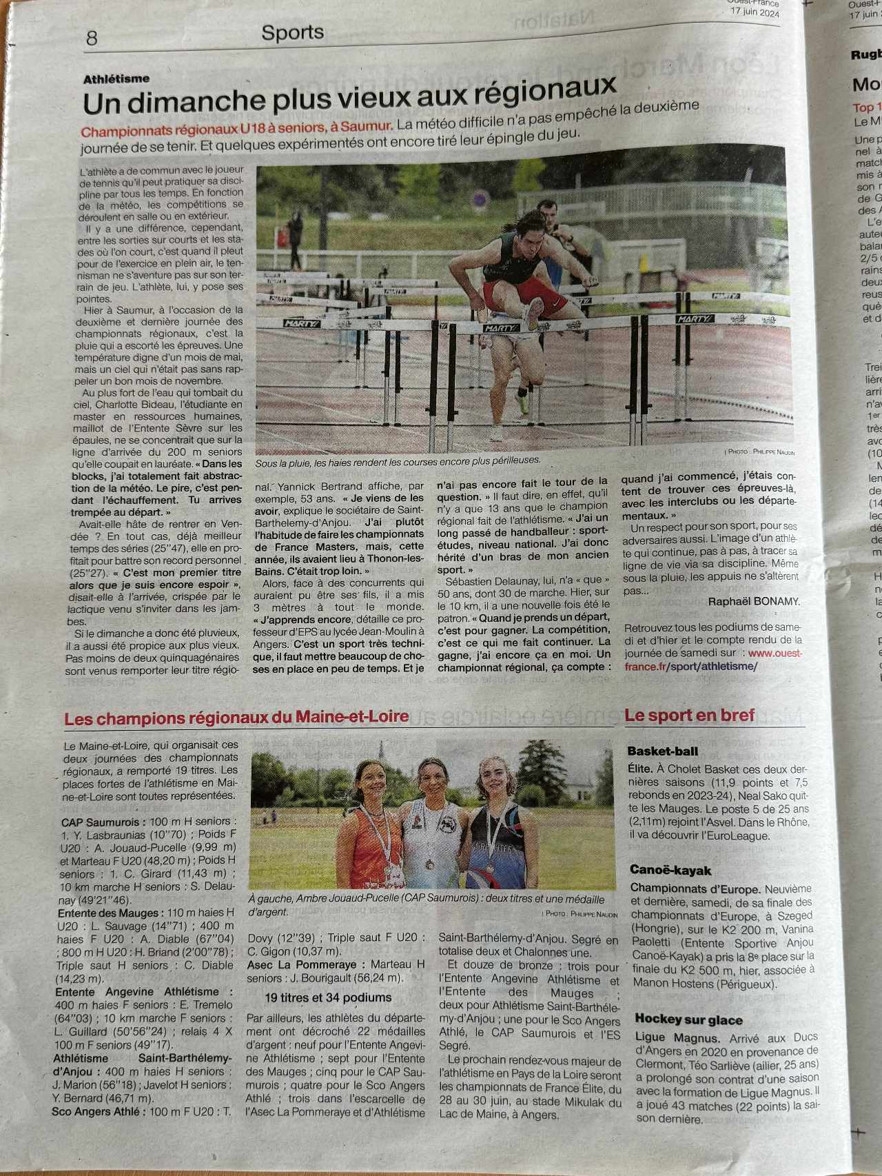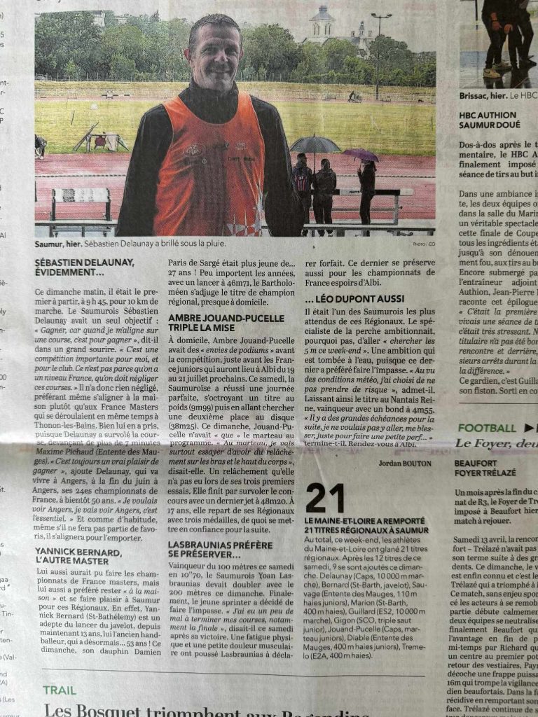 Les autres résultats du week-end : -Aux régionaux minimes également, Jules THEGNER termine à la 4e place sur l’épreuve du triple-saut avec 10m93 et sur celle du lancer de marteau avec 26m99. -Ambre JOUAND-PUCELLE envoie le disque à 37m29 et le marteau à 45m53 au meeting de lancers de Savenay samedi. -Également à Savenay, Yves SAVARIAUD réalise son meilleur jet de la saison au lancer de disque avec une meilleure performance de 33m59.
