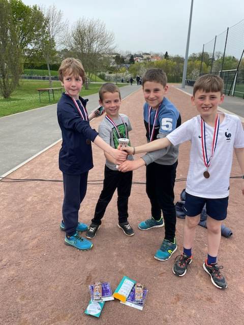 L’équipe des éveils garçons, constituée de Philéas, Kylian, Victor et Albin, monte sur la 3e marche du podium.
